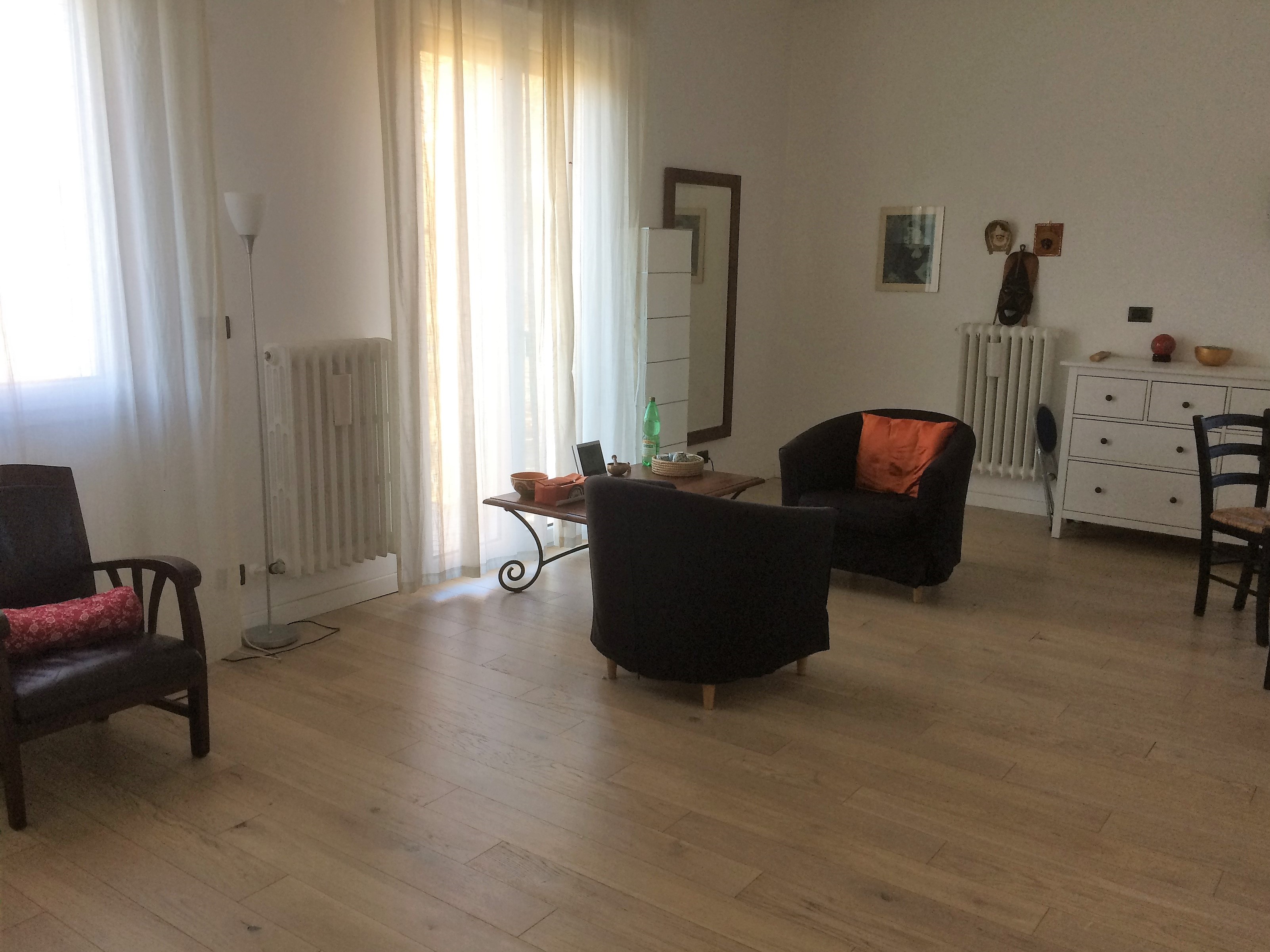 Ampia stanza con parquet, molto luminosa, pala ventilatore al soffitto.