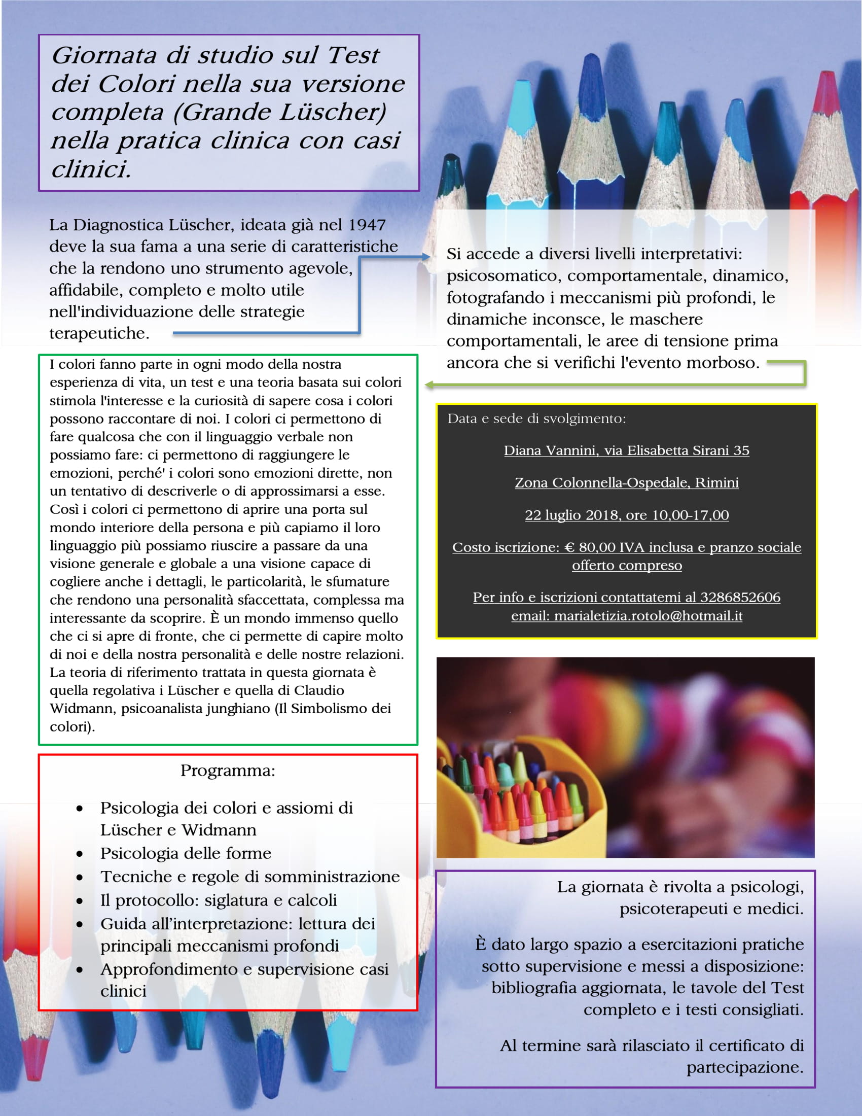 I colori fanno parte in ogni modo della nostra esperienza di vita, un test e una teoria basata sui colori stimola l'interesse e la curiosità di sapere cosa i colori possono raccontare di noi. I colori ci permettono di fare qualcosa che con il linguaggio verbale non possiamo fare: ci permettono di raggiungere le emozioni, perché' i colori sono emozioni dirette, non un tentativo di descriverle o di approssimarsi a esse. Così i colori ci permettono di aprire una porta sul mondo interiore della persona e più capiamo il loro linguaggio più possiamo riuscire a passare da una visione generale e globale a una visione capace di cogliere anche i dettagli, le particolarità, le sfumature che rendono una personalità sfaccettata, complessa ma interessante da scoprire. È un mondo immenso quello che ci si apre di fronte, che ci permette di capire molto di noi e della nostra personalità e delle nostre relazioni. La teoria di riferimento trattata in questa giornata è quella regolativa i Lüscher e quella di Claudio Widmann, psicoanalista junghiano (Il Simbolismo dei colori).