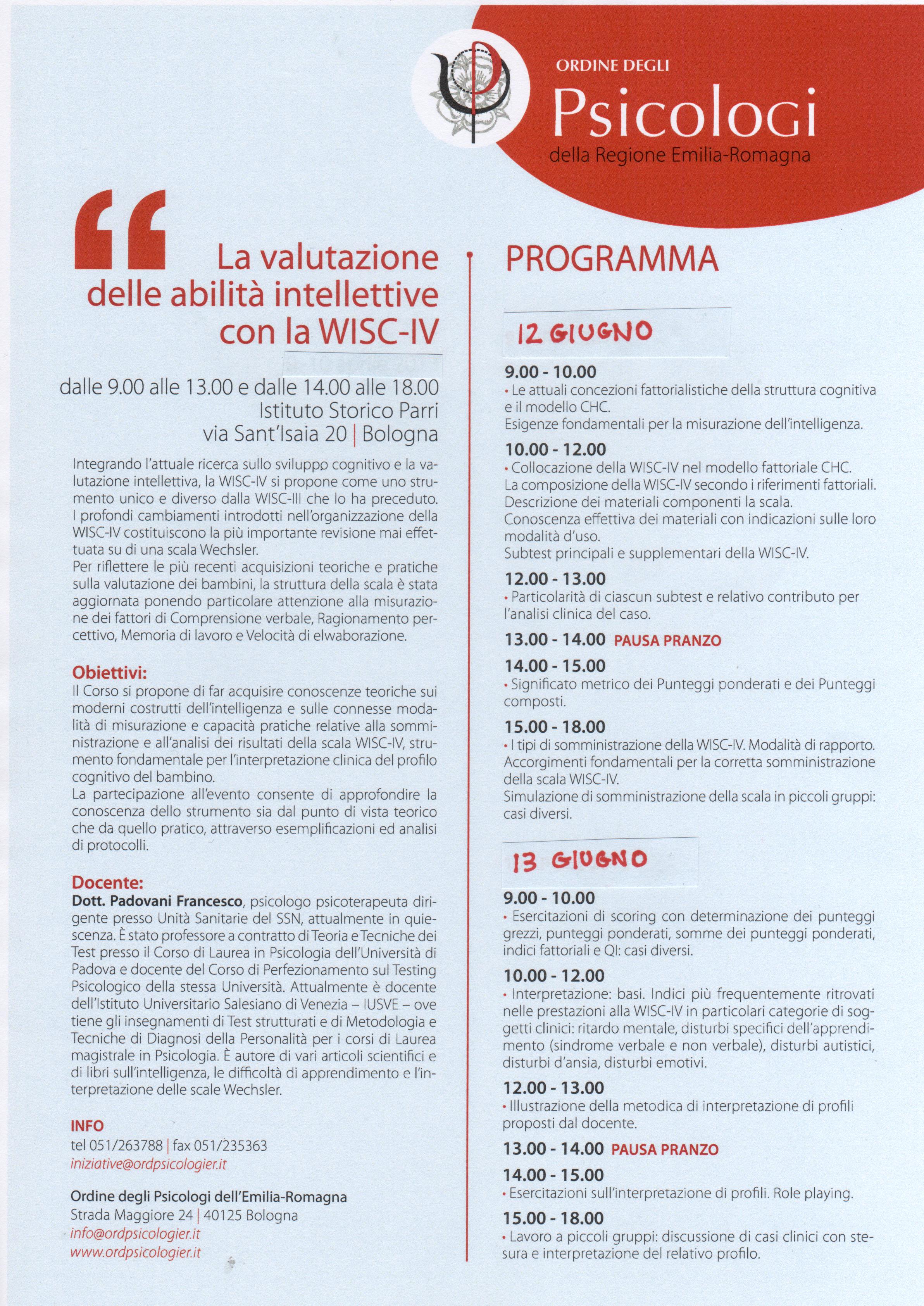 - L’interpretazione clinica della scala WISC-IIIl – 15 e 16 novembre 2011; 17 e 18 gennaio 2012; 14 e 15 febbraio 2012