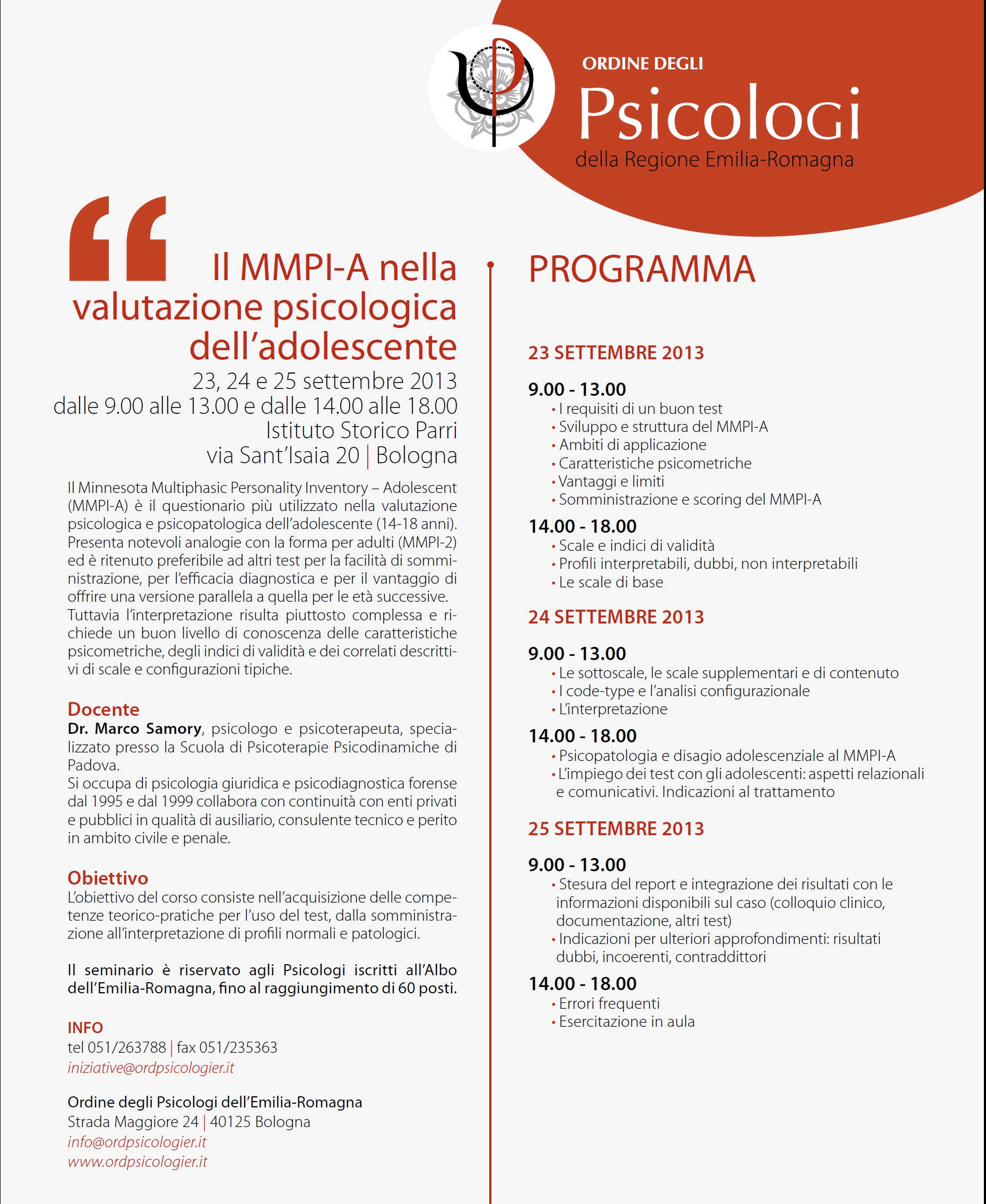 - Il MMPI-2 e il MMPI-A nella valutazione psicologica, RIEDIZIONE - 4, 5 e 6 luglio 2012 (Il programma del seminario resta invariato. Per informazioni sugli argomenti affrontati, consultare la locandina della prima edizione)