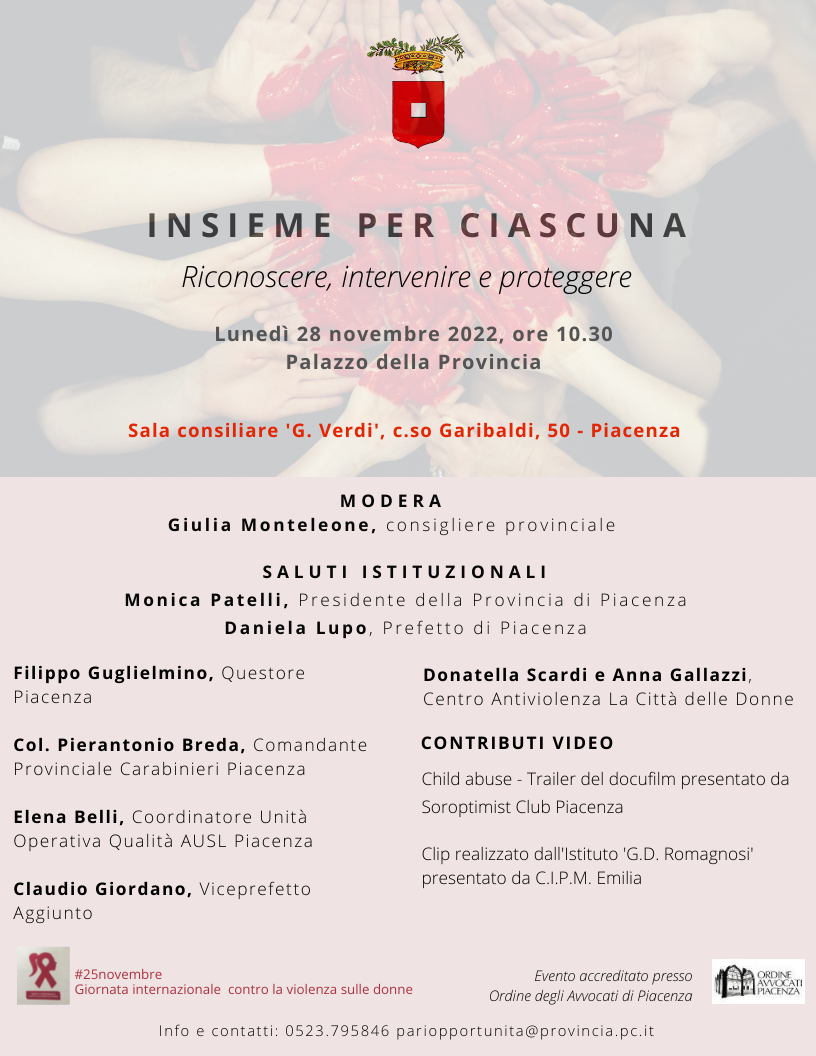 Convegno organizzato dal "Tavolo Provinciale contro la violenza" della Provincia di Piacenza - Ufficio Pari opportunità per celebrare la giornata del 25 novembre contro la violenza sulle donne.