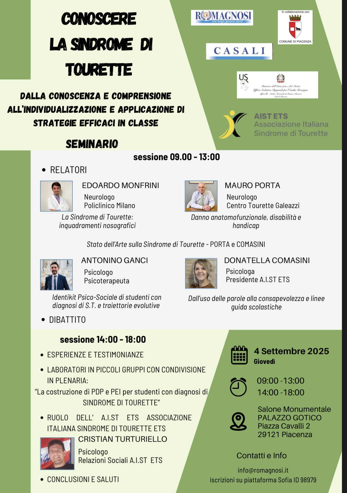 Il seminario "Conoscere la Sindrome di Tourette - Dalla conoscenza e comprensione all'individualizzazione e applicazione di strategie efficaci in classe" organizzato dall'Associazione Italiana Sindrome di Tourette si terrà il 4 settembre 2025 presso il Palazzo Gotico - Salone Monumentale - Piacenza.