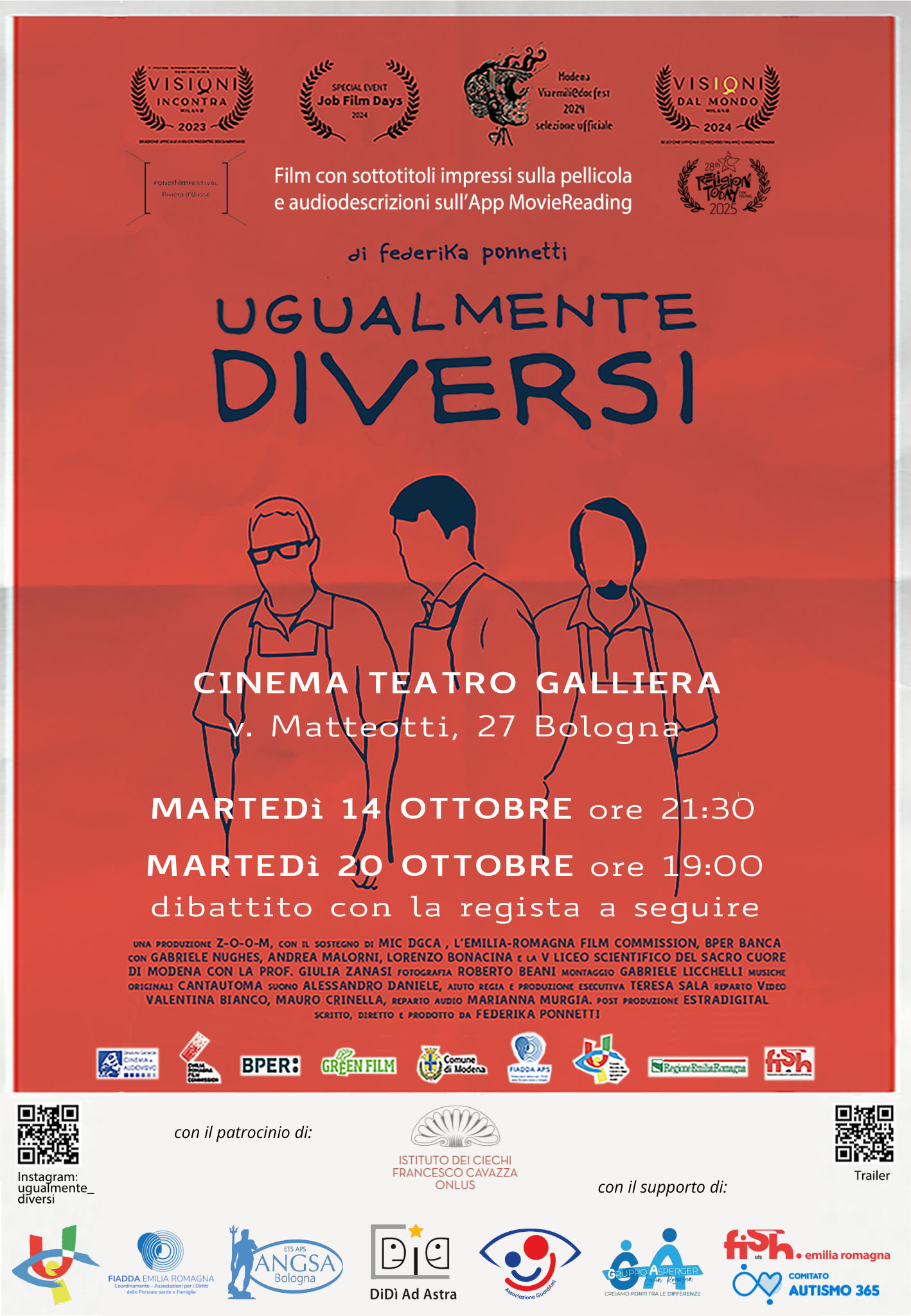 Il 20 Ottobre alle 19:00 al Cinema Galliera di Bologna con la presenza in sala della regista Federika Ponnetti e la collaborazione di associazioni e realtà locali ci sarà la proiezione del docufilm "Ugualmente Diversi" e a seguire una chiacchierata insieme al pubblico e il 14 Ottobre alle 21:30 solo proiezione.